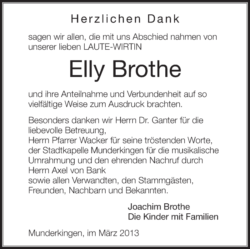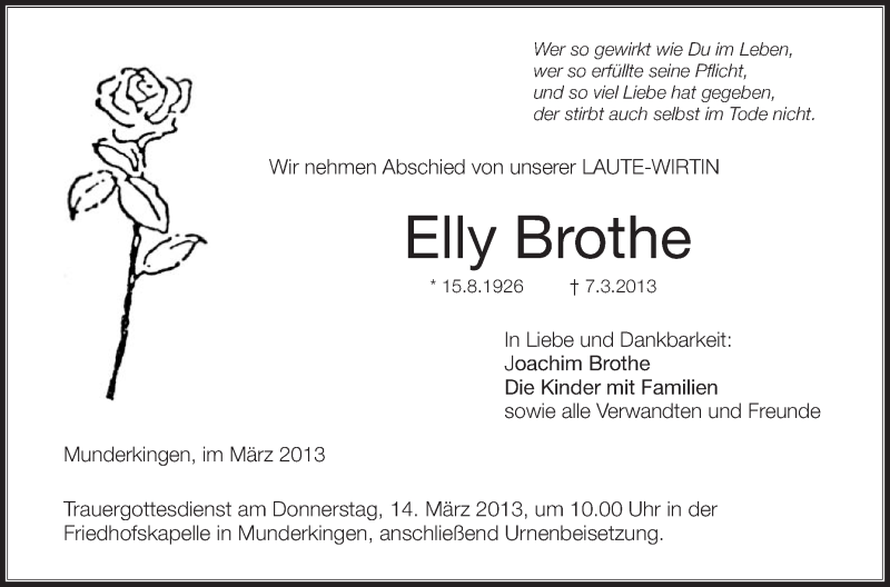Hier finden Sie alle Traueranzeigen aus der Zeitung, die bisher für Elly Brothe erschienen sind. Weitere Traueranzeigen, die in der Zeitung erscheinen, werden hier ebenfalls aufgelistet