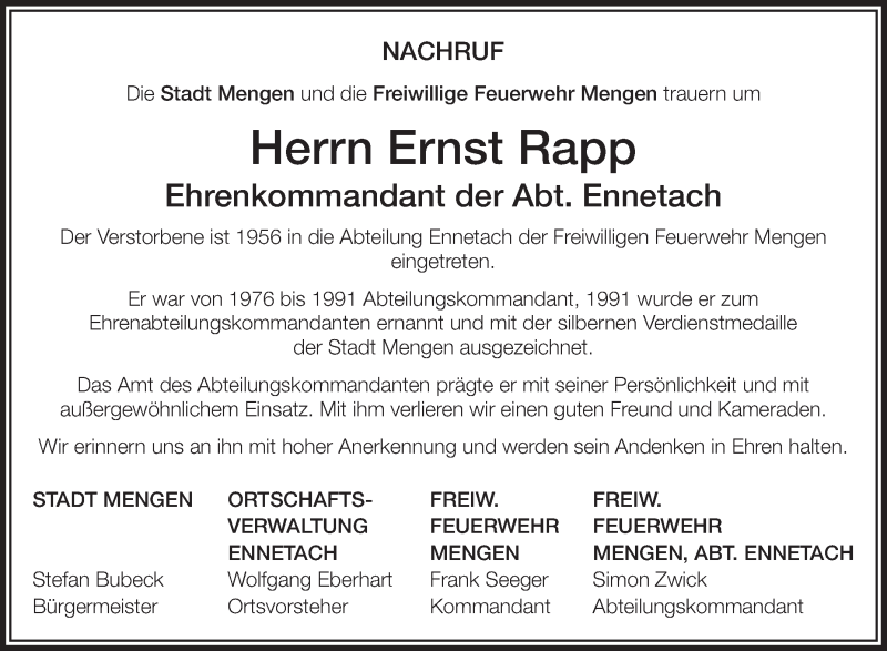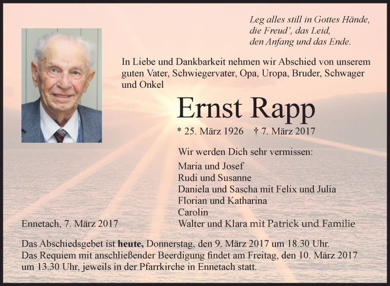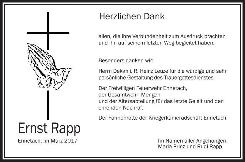 Hier finden Sie alle Traueranzeigen aus der Zeitung, die bisher für Ernst Rapp erschienen sind. Weitere Traueranzeigen, die in der Zeitung erscheinen, werden hier ebenfalls aufgelistet