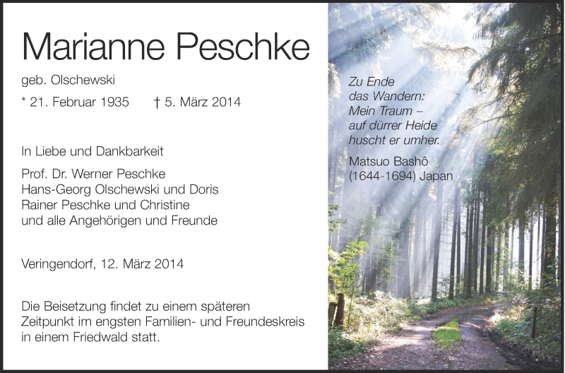 Hier finden Sie alle Traueranzeigen aus der Zeitung, die bisher für Marianne Peschke erschienen sind. Weitere Traueranzeigen, die in der Zeitung erscheinen, werden hier ebenfalls aufgelistet
